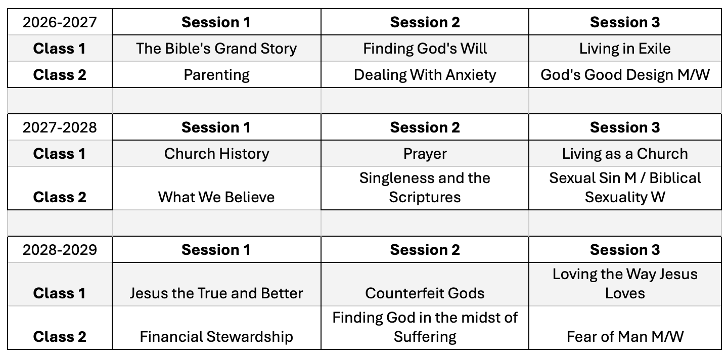 Connection Classes are short-term (six-seven weeks) and occur in the Christian Challenge building from 9:30am -10:45am and from 11:15am-12:30pm on Sunday mornings. Over three years, these classes will allow you to interact with all the major themes of the Bible. Curious what classes we offer? Below you’ll find a three-year schedule.